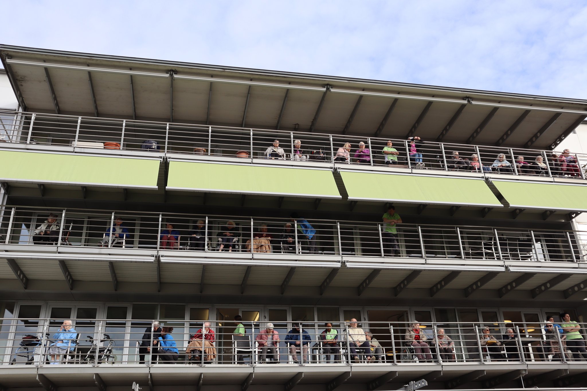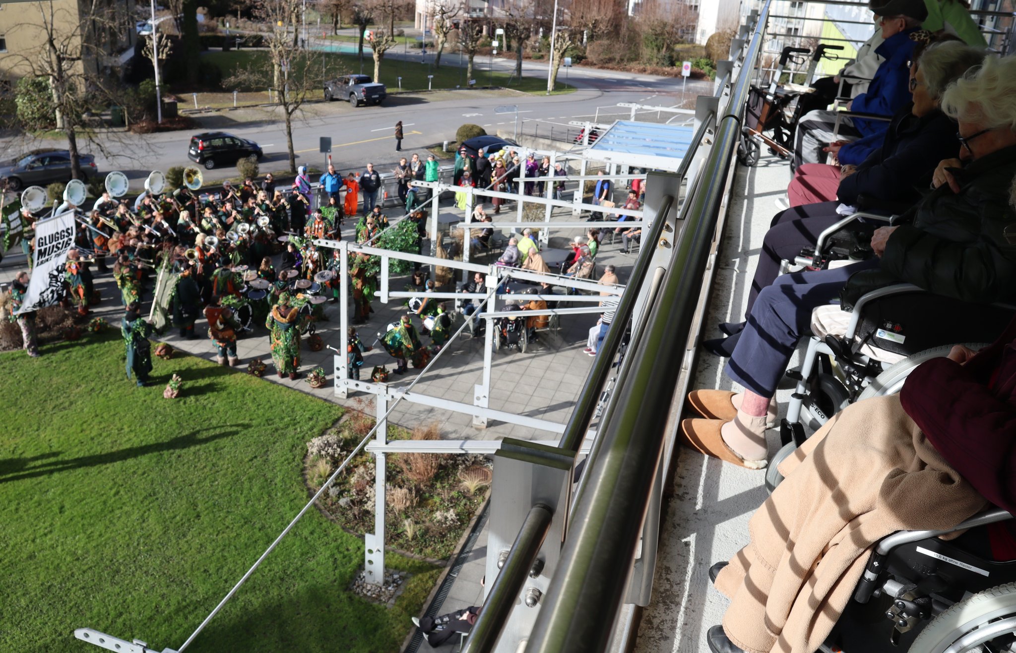 Viele Bewohnerinnen und Bewohner, Mitarbeitende und Gäste versammelten sich warm eingepackt auf der Terrasse oder genossen das Konzert gemütlich vom Balkon aus. Die mitreissende Musik, fröhliche Begegnungen und das närrische Treiben machten den Nachmittag zu einem besonderen Erlebnis.