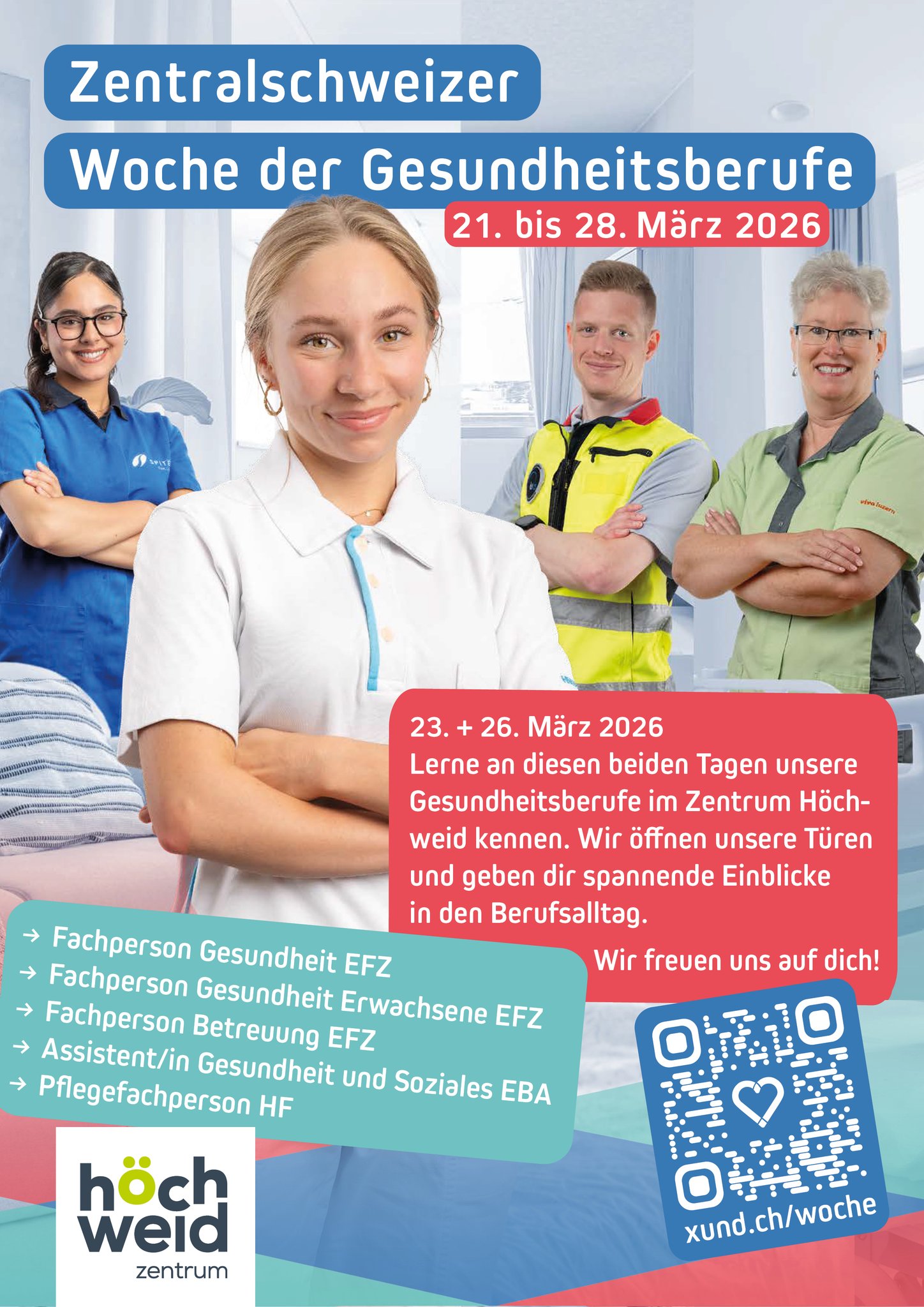 Im Rahmen der Woche der Gesundheitsberufe öffnet das Zentrum Höchweid in Ebikon am 23. und 26. März 2026 seine Türen und gewährt Einblicke in die verschiedenen Berufsfelder im Gesundheitswesen.